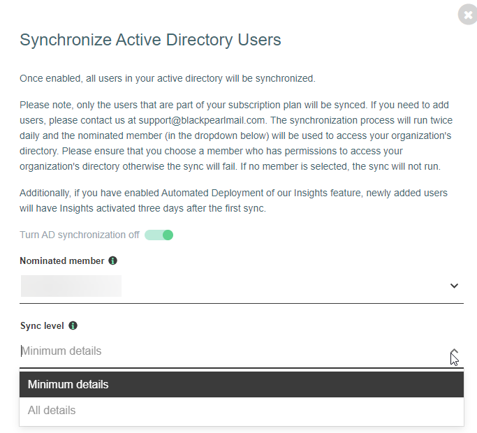 - Sync Minimum Details - this will sync only Name and Email address your your Active directory to Black Pearl Mail