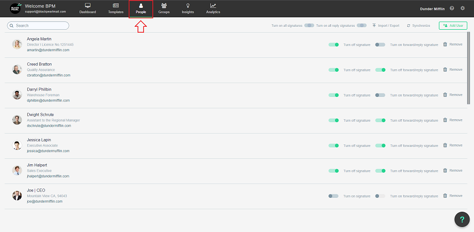 - The People Tab is where you add the email signature details of your users - fields need to be populated here to feed through to your email signatures. This includes information such as job title, contact details, and individual social media links, i.e LinkedIn.