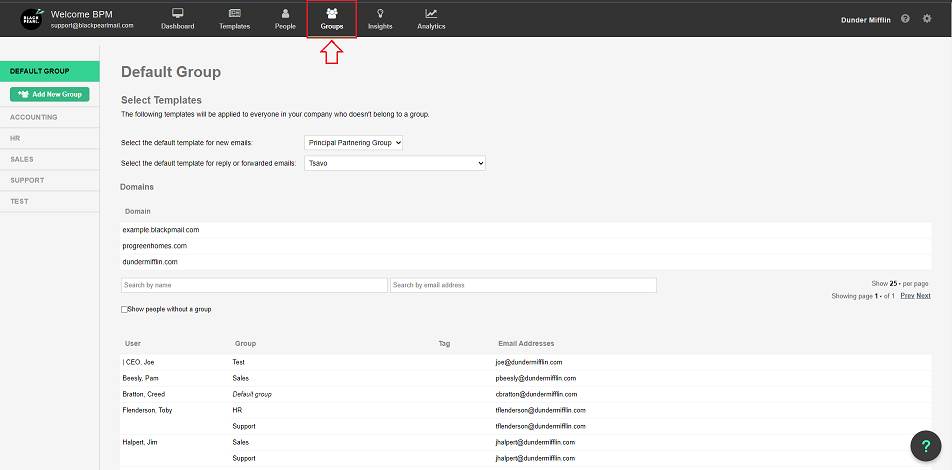 - The Groups Tab is where templates and people come together - this is how you assign a signature template design to be used by a specific user(s), and also add shared group contact details if you’d like them to appear in their signatures too. i.e company-based social media links, company address, etc.