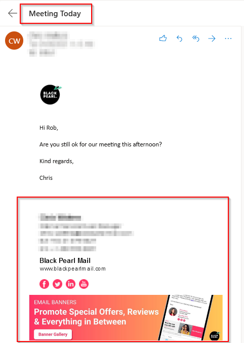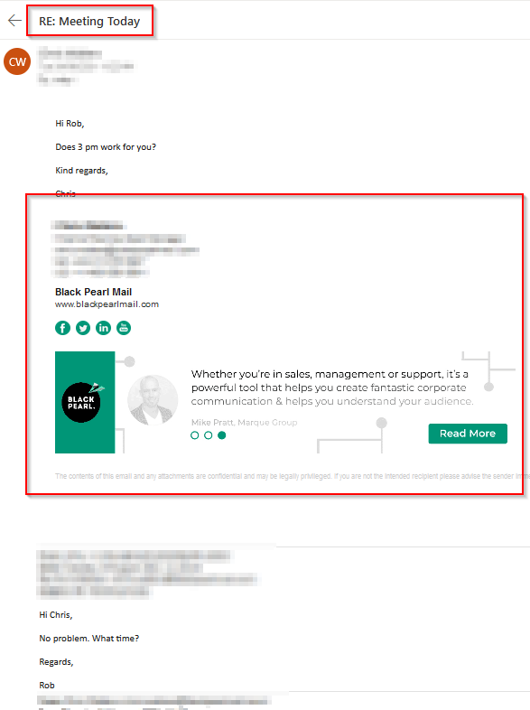 If the subject is modified in anyway and the FW: or RE: is removed, then this can cause inconsistencies with branding. For example, if the "RE:" or "FW:" is removed on an email chain that included 10 replies, then Black Pearl Mail will assume this is a new email and place the lower portion of the branding at the very bottom of the email, below all 10 replies. For this reason, it is important not to alter the subject in anyway. If the subject needs to be changed, we suggest creating a new email.