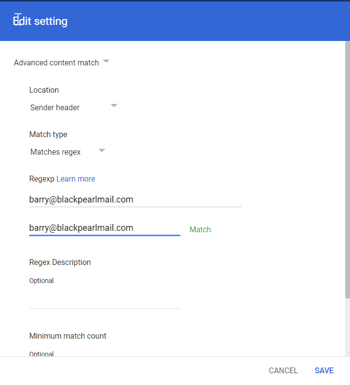- Enter email address of the user you want to route through Black Pearl Mail into the Regex area e.g. barry@blackpearlmail.com. If you would like multiple users to route through, then each email address can be separated with a pipe e.g. barry@blackpearlmail.com|joe@blackpearlmail.com