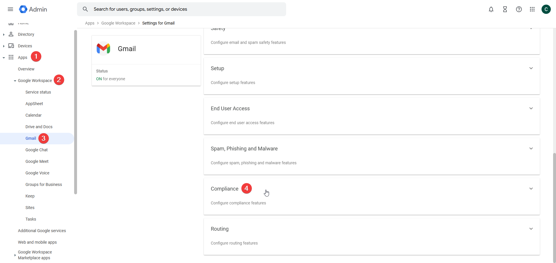 Click Apps-> Google Workspace ->Gmail -> Compliance