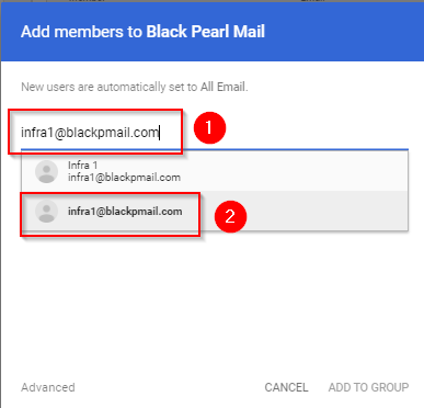 8) This is the part where we add all the members that we don not want to route through Black Pearl Mail. Enter the email address of the user in the search field and then select it from the list.