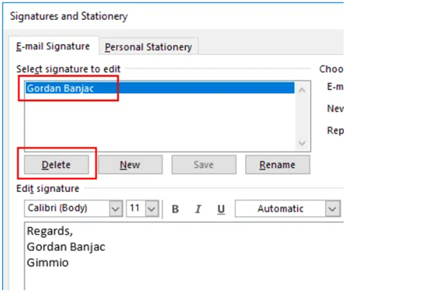 Select the signature you wish to remove. You can either click the Delete button to completely remove (shown below)