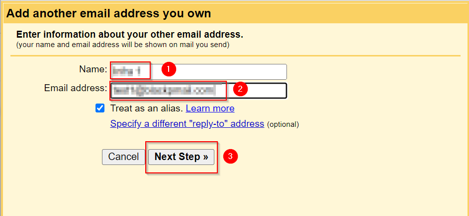 6. Enter a name for the account, then enter the email address of the alias you would like to add, and then click